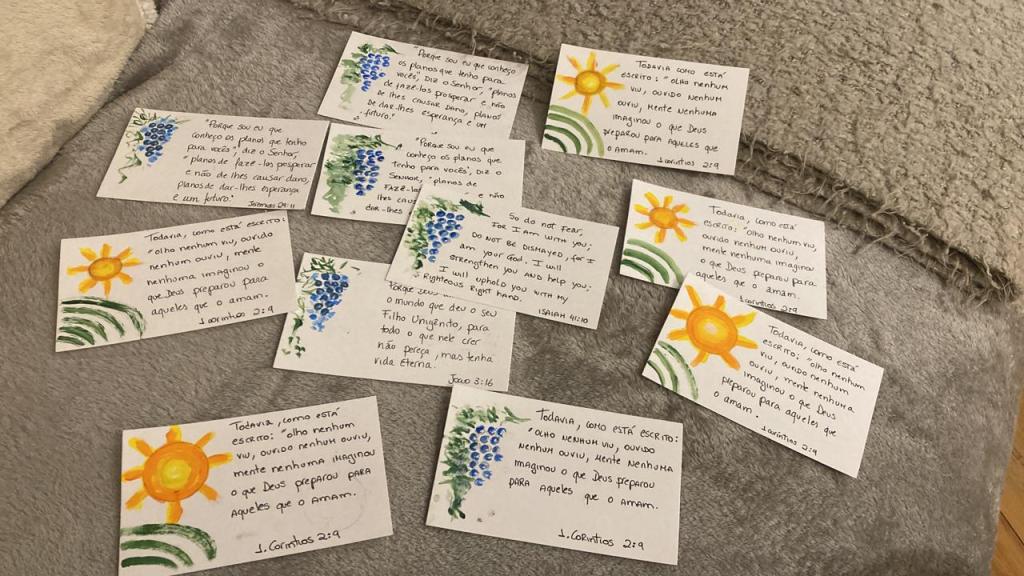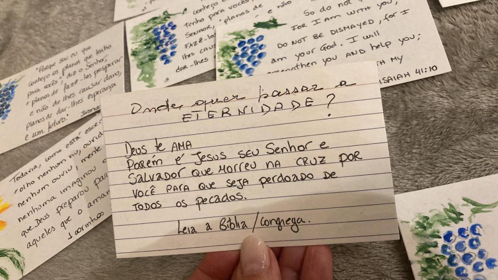 “Where will you spend eternity?” cards have been lovingly hand painted in Brazil by Letizia (born in Piedmont, Italy in 1933) – the mother of our friend and prayer partner, Tiziana*. Each card illustrates a Scripture (written in English, Portuguese or Spanish by Tizi) to offer encouragement to those with whom we interact as we go about our daily business: the taxi driver, the checkout clerk, the service station attendant, a passenger on a train or bus, or wherever the LORD takes us on our journey through life.