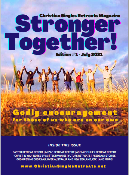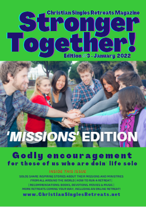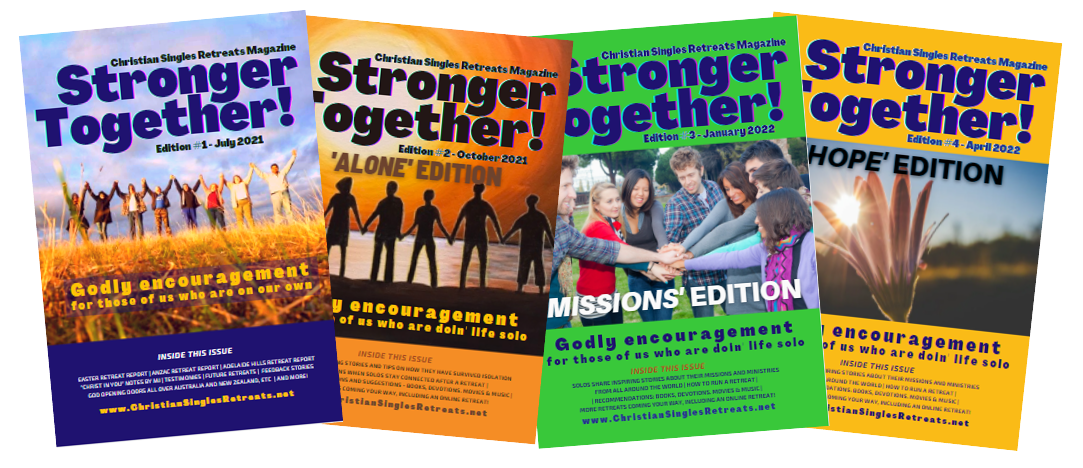 A free quarterly online magazine, written by solo believers, for solo believers, encouraging us in our faith and walk with the LORD. Full of news about upcoming retreats, stories from all over the world on a theme, plus recommendations for Godly growth, and testimonies of God’s faithfulness. To read, click on the links below.